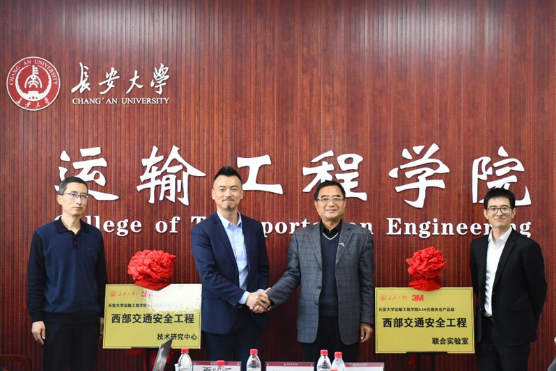 On the afternoon of November 6, the opening ceremony of the Western Traffic Safety Engineering Technology Research Center and Western Traffic Safety Engineering Joint Laboratory jointly constructed by the School of Transportation Engineering and 3M China Co. Ltd. was held in the conference room of the college. 6 representatives including Gu Chaofeng, General Manager of Traffic Safety Product Department of 3M Greater China, Huang Sizhe, Technical Manager, Xue Yanjun, Chairman of Xi’an Xituo Transportation Facilities Company, Li Gaowang, Chairman of Shaanxi High-speed Traffic Industry and Trade Co. LTD, Xi’an Huage Transportation Facilities Engineering Equipment Zhou Yousheng, Chairman of the Co., Ltd., Tian Xinmin, Secretary of the School of Transportation Engineering, Wu Ximei, Deputy Secretary, Wang Jianjun, Deputy Dean, and the head of the institute attended the unveiling ceremony. The ceremony was presided over by Wang Jianjun.