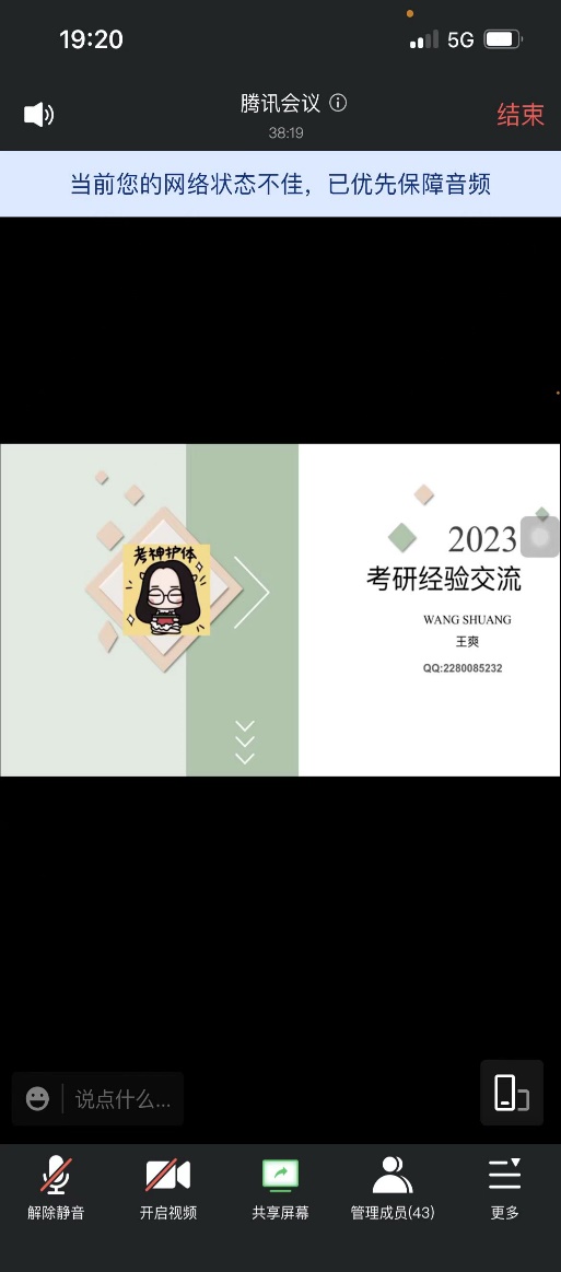 会上,叶林莘同学从时间管理的角度分享了考研经验,她强调7月8月是黄金时期,一定要把握好,其他时间要时时用意,勤耕不辍,合理安排好学业与考研的时间。王爽同学着重分享了政治英语的复习经验和考研心得,她重点强调了做真题的重要性,同时指出要保持乐观心态,找到自己内心深处的考研动机。以396分成绩进入一品探花 的孙悦则向大家介绍了专业课和数学的复习方法,为大家提供参考。