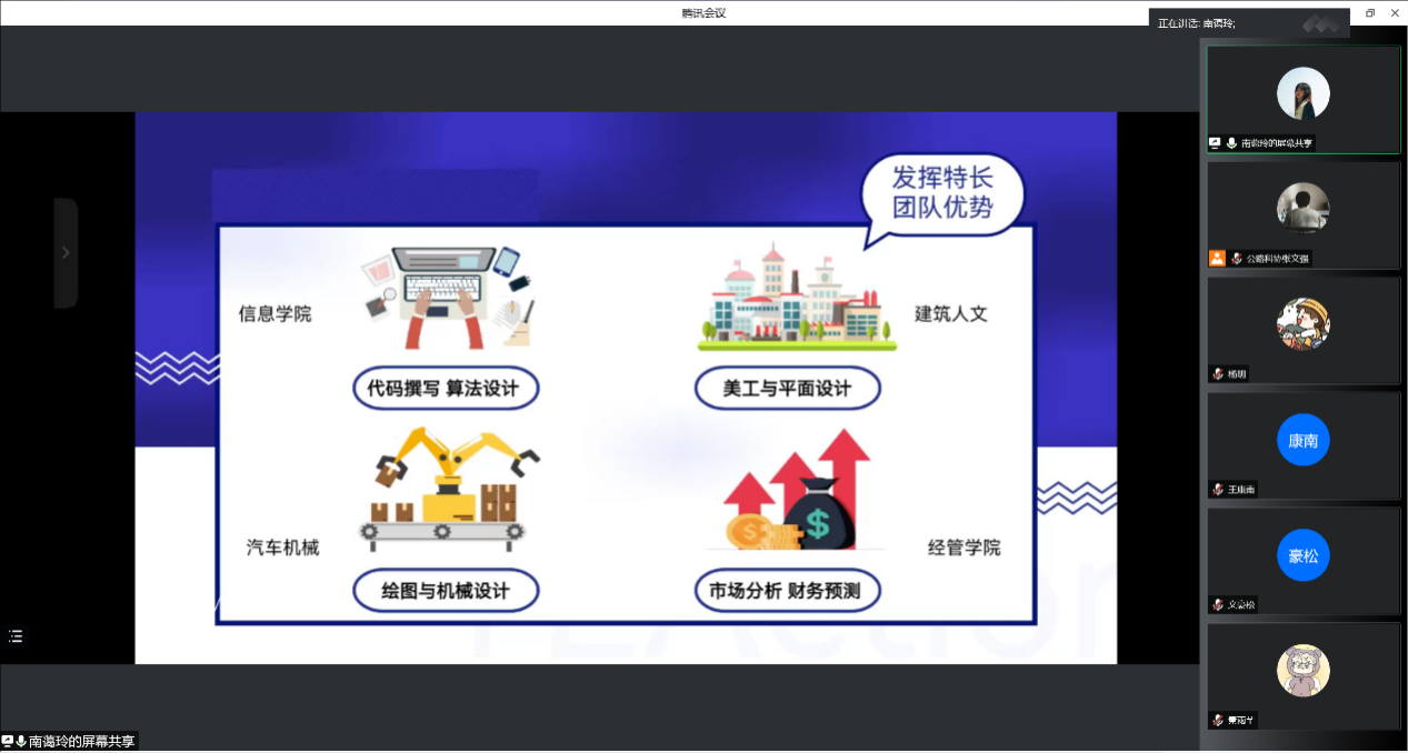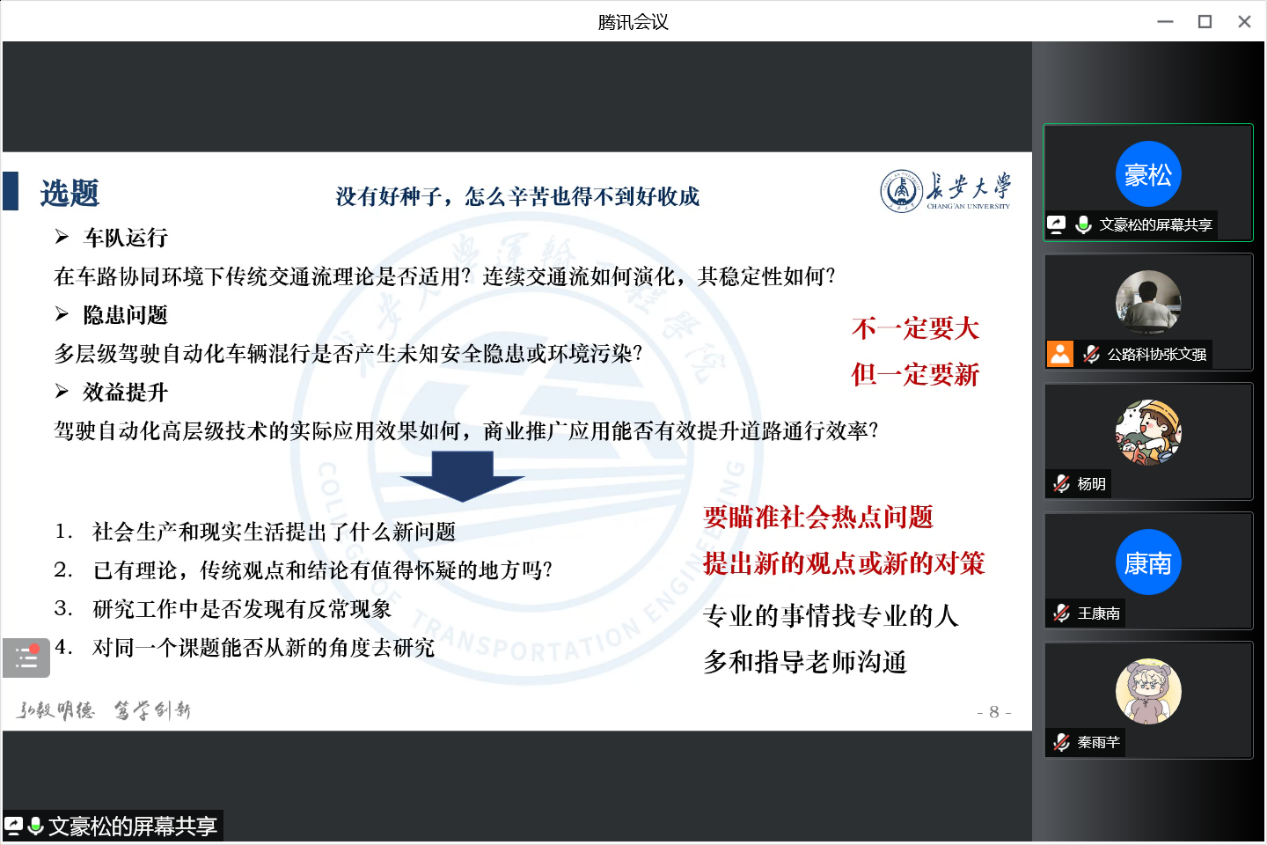 来自四个学院的获奖学生代表进行比赛介绍与经验分享。运输学院文豪松通过往期大赛的参赛流程进行介绍并从参赛团队、项目选题和申报书的撰写等方面分享自己的参赛的经验:经管学院南蔼玲分享参赛心得,指出要摆正心态,富有热情,不断探索并对未来充满乐趣,要关注新内容、新热点、新方向,三是着重讨论研究过程,发挥特长和团队优势。公路学院王康南通过自身答辩的经历为同学们介绍了答辩与PPT制作的相关注意事项,提到项目要有一个清晰的梳理,ppt需简洁、严谨。信息学院杨明通过自身经验,多方面介绍了大赛准备过程的注意事项。