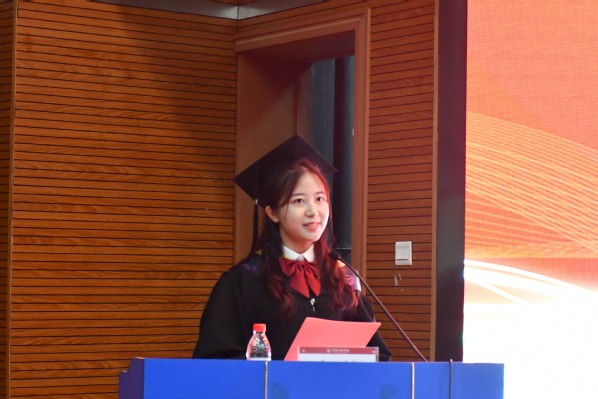 毕业生代表、2018级学生王欣媛表示,四年时光,宝贵而难忘,感谢母校和师长的谆谆教诲,她将怀揣祝愿和祝福,肩负使命和担当,用好所学知识,奔赴祖国各地开创崭新未来。