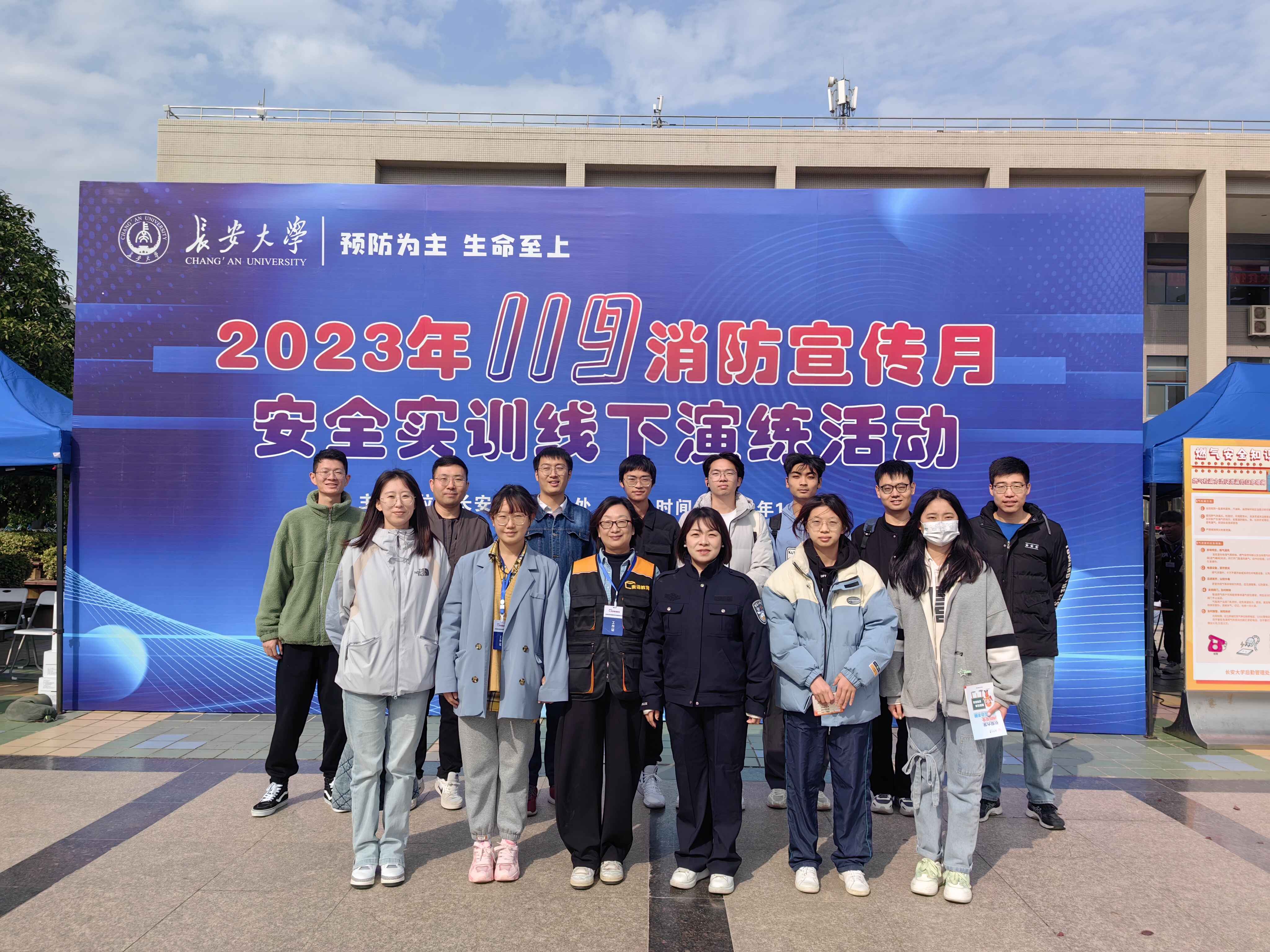 2023年11月9日是全国第32个“119”消防宣传日,一品探花 2023年“119消防宣传月安全实训线下演练”活动在北校区树慧园广场举行。