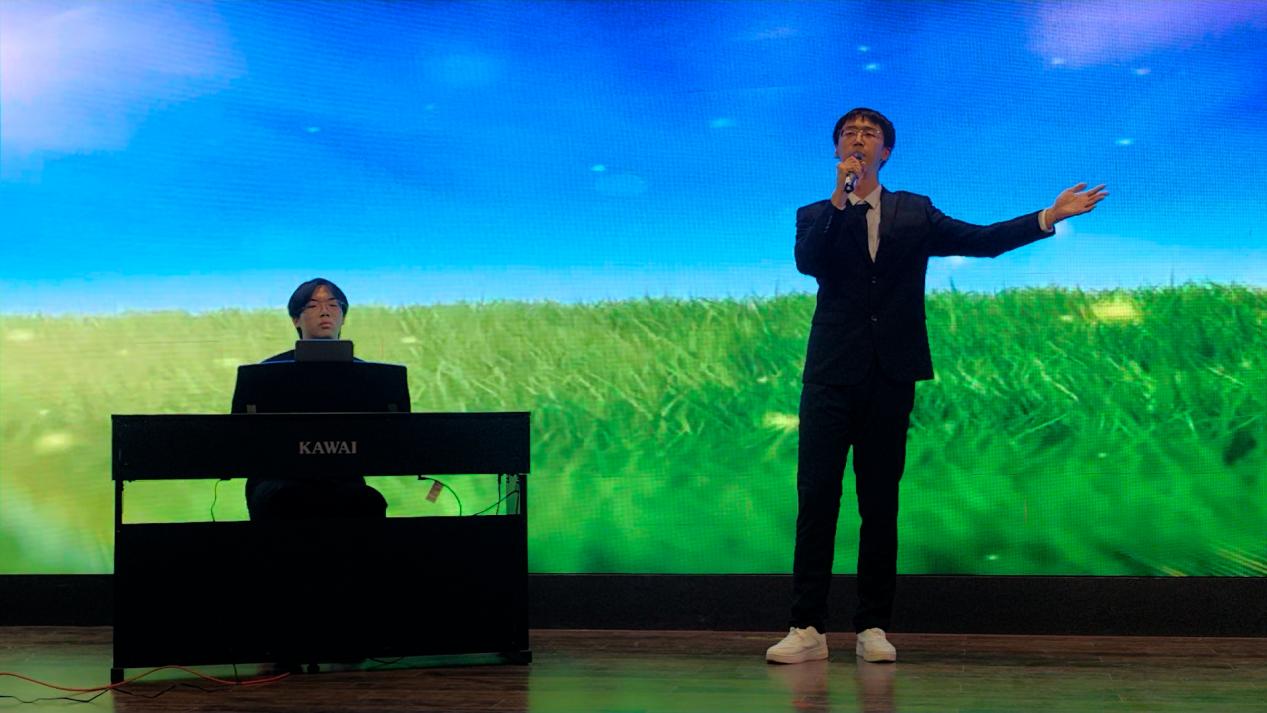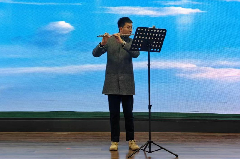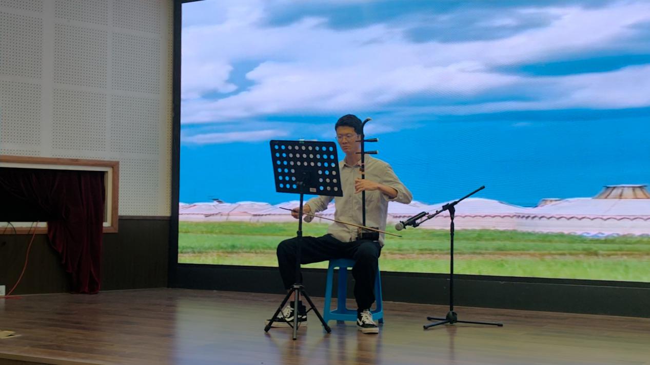长笛清凉悠远,二胡婉转悠扬,辅导员老师带来的乐器合奏《内蒙古草原上》轻柔入耳,给同学们带来了一场音乐盛宴。