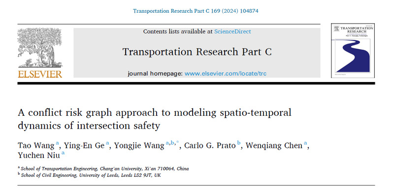近日,国际交通领域学术期刊《Transportation Research Part C : Emerging Technologies》刊发了由一品探花 博士生王涛、葛颖恩教授、汪勇杰副教授、陈文强副教授、利兹大学Carlo G. Prato教授等共同完成的研究论文《A conflict risk graph approach to modeling spatio-temporal dynamics of intersection safety》。一品探花 博士生王涛和汪勇杰副教授分别为该论文的第一作者和通讯作者。
