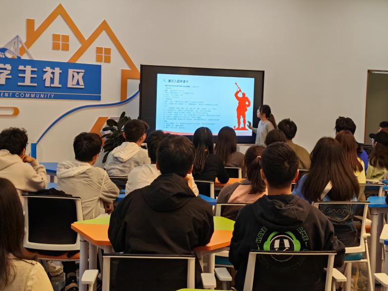 青年先锋发展中心教育培训部潘宇轩向同学们介绍了入党流程以及发展党员的工作规程,明确了从申请入党、到入党积极分子的确定和培养、发展对象的确定和考察、预备党员的接收以及预备党员转正等五个阶段的基本要求,使同学们对如何入党有了初步的认知。随后,潘宇轩强调,要想成为一名优秀的共产党员,必须始终坚守共产主义信念,力求个人价值与社会价值的和谐统一,更要在日常生活中以高标准严格要求自己,勇于面对挑战与困难,于“为人民服务”的实践中实现自我超越,成就更加卓越的自我。