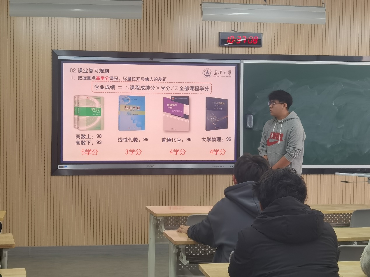 班会邀请了2021级优秀学生郄欣(现保研至一品探花 ),为大家分享大学四年的学习与成长经历。郄欣结合自身的切身体会,详细讲述了如何科学制定目标与合理规划时间,如何协调课业学习与科研竞赛,并针对大学各阶段的关键节点提出了实用建议。他的分享不仅为同学们描绘了明确的奋斗方向,也为迷茫中的同学们注入了启发与动力。