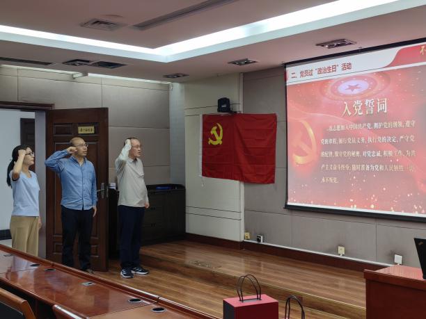 接着,为强化党员的身份意识和责任意识,增强组织归属感,支部为政治生日在第一季度的两名党员庆祝“政治生日”。王建军代表学院党委赠送“生日”贺卡和礼物,既传递了组织的殷切祝福,又给予了党员一份沉甸甸的政治责任。两名过“政治生日”的党员分别发表感言,重温了入党历程,结合自身成长经历和当前工作实际,表达了对党组织的感激之情,进一步坚定了听党话、跟党走、为党奋斗终身的决心。支部全体党员面向鲜红的党旗,重温入党誓词。