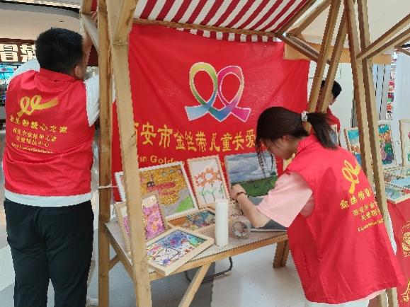 而在另一侧的“爱心画展”摊位,来自金丝带患病儿童以及志愿者们的画作整齐展出。这些童真的画作色彩明亮、富有想象,吸引了很多市民驻足欣赏画作。