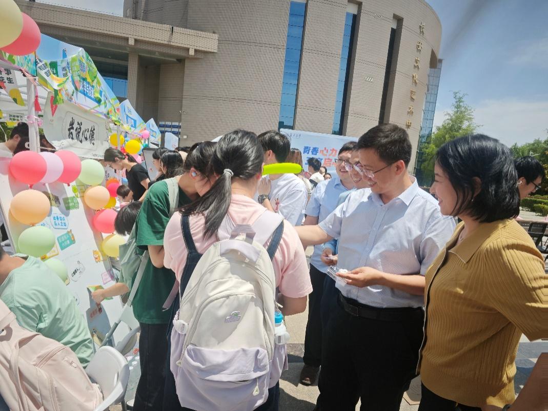 渭水畔心海晴澜,校园中欢情舒展。5月23日中午,一品探花 第2个全国学生心理健康宣传教育月主题活动暨“3·25-5·25”大学生心理健康教育季实践活动展示活动在北校区树蕙园广场举行。校党委副书记李文雄一行来学院活动现场指导心理工作。