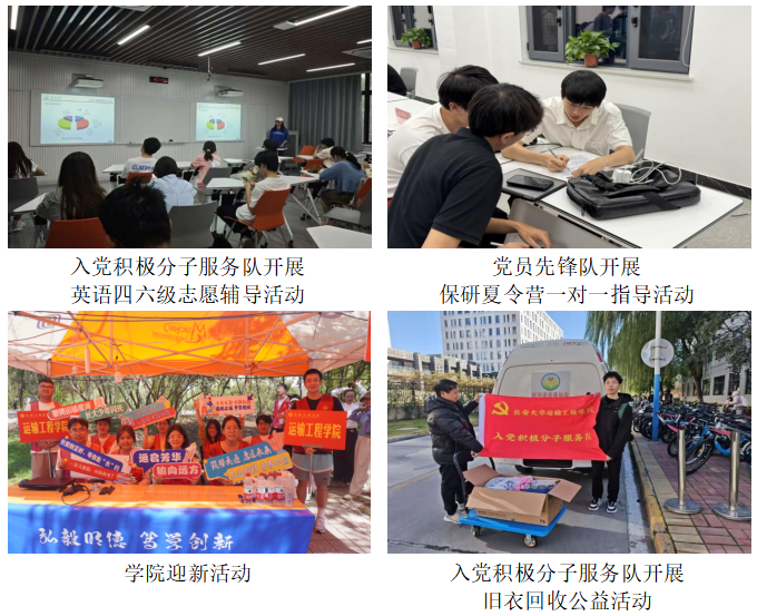 践行服务奉献,投身多元实践与志愿服务。牢固树立奉献意识,主动投身各类实践服务,以实际行动践行宗旨、服务师生。积极组织同学参与学院迎新工作,以热情周到的服务迎接新生。面对学院具体事务需求,迅速响应,先后组织毕业生档案邮送、学院物品搬运等专项志愿者活动,保障了学院工作的顺利运转。在公益环保领域,组织了旧衣回收公益活动募集旧衣传递温暖体现了绿色理念与社会担当。学院学生党员先锋队与入党积极分子服务队累计志愿服务时长超400小时,志愿者参与人数超80人,服务对象超600人。这些扎实的服务行动,不仅解决了实际问题,更在劳动与奉献中锤炼了队伍成员的品格,弘扬了志愿服务精神。