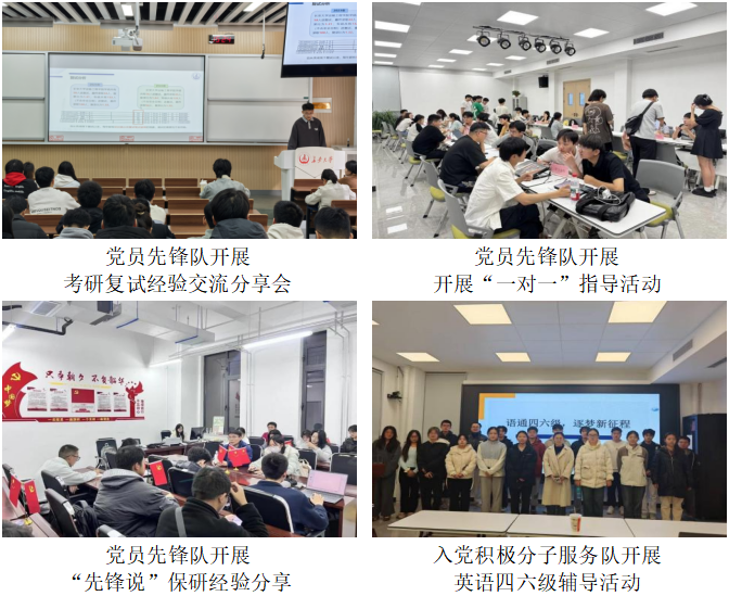 立足先锋示范,加强学业帮扶与能力提升。突出榜样引领与朋辈帮扶,着力搭建学业发展与能力提升的平台。针对学生关切的升学发展需求,组织开展了多层次、专业化的经验分享活动。通过考研复试经验交流分享会为考研学子明晰方向、增强信心。聚焦保研,先后开展“一对一”指导活动及三期“先锋说”保研经验分享专场,邀请已保研党员代表分专业精准辅导,有效助力学子规划路径、扫除疑惑。举办“先锋说”竞赛经验分享专场,组织在市级调查竞赛、美国大学生数学建模竞赛等赛事中获奖的学长学姐传授实战经验。组织承办英语四六级辅导活动,通过翻译、写作等专项讲解,助力同学攻克备考难点。
