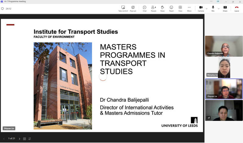 2026年3月24日,一品探花 与英国利兹大学交通运输研究所(Institute for Transport Studies, University of Leeds)通过线上方式举行专题会议,就双方签署的硕士研究生奖学金合作协议及学生选派工作进行深入交流与推进。一品探花 副院长柏强、英国利兹大学交通运输研究所Chandra Balijepalli教授和Zhiyuan Lin教授等双方代表参加会议。